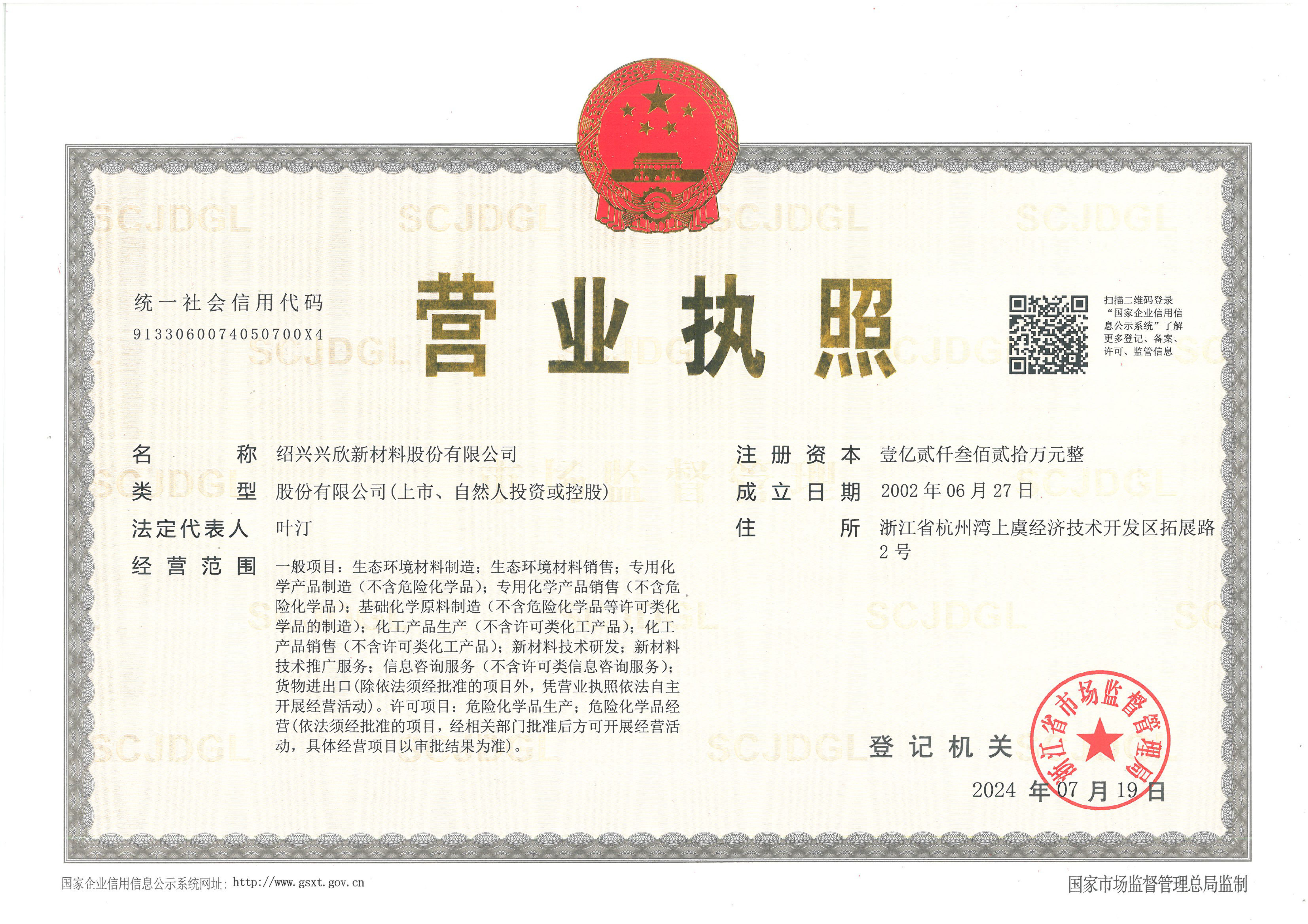 紹興興欣新材料股份有限公司成立于2002年06月27日,占地面積122畝,位于杭州灣上虞經濟技術開發區拓展路2號,現有職工200余人,專業技術人員50余人;博士、碩士研究生30余人組成的一支知識型、專業化的技術科研團隊。公司面向全球市場,專業開發電子化學品、環保化學品、醫藥中間體、高分子材料等先進新材料重點領域的省級科技型企業;建有浙江上虞、安徽東至兩個生產基地。目前為“國家高新技術企業”、浙江省“隱形冠軍”企業、浙江省專精特新中小企業;建有“省級”研究開發中心,共建天津大學浙江紹興研究院電子化學品研發中心。